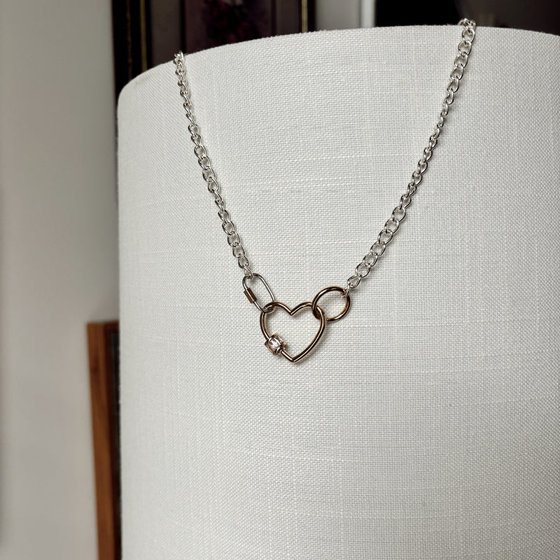This necklace is a triple threat. Complete with a heart carabiner, mini carabiner, and a circle for some added dimension. This piece is mixed metals so can easily be layered with all jewelry types.